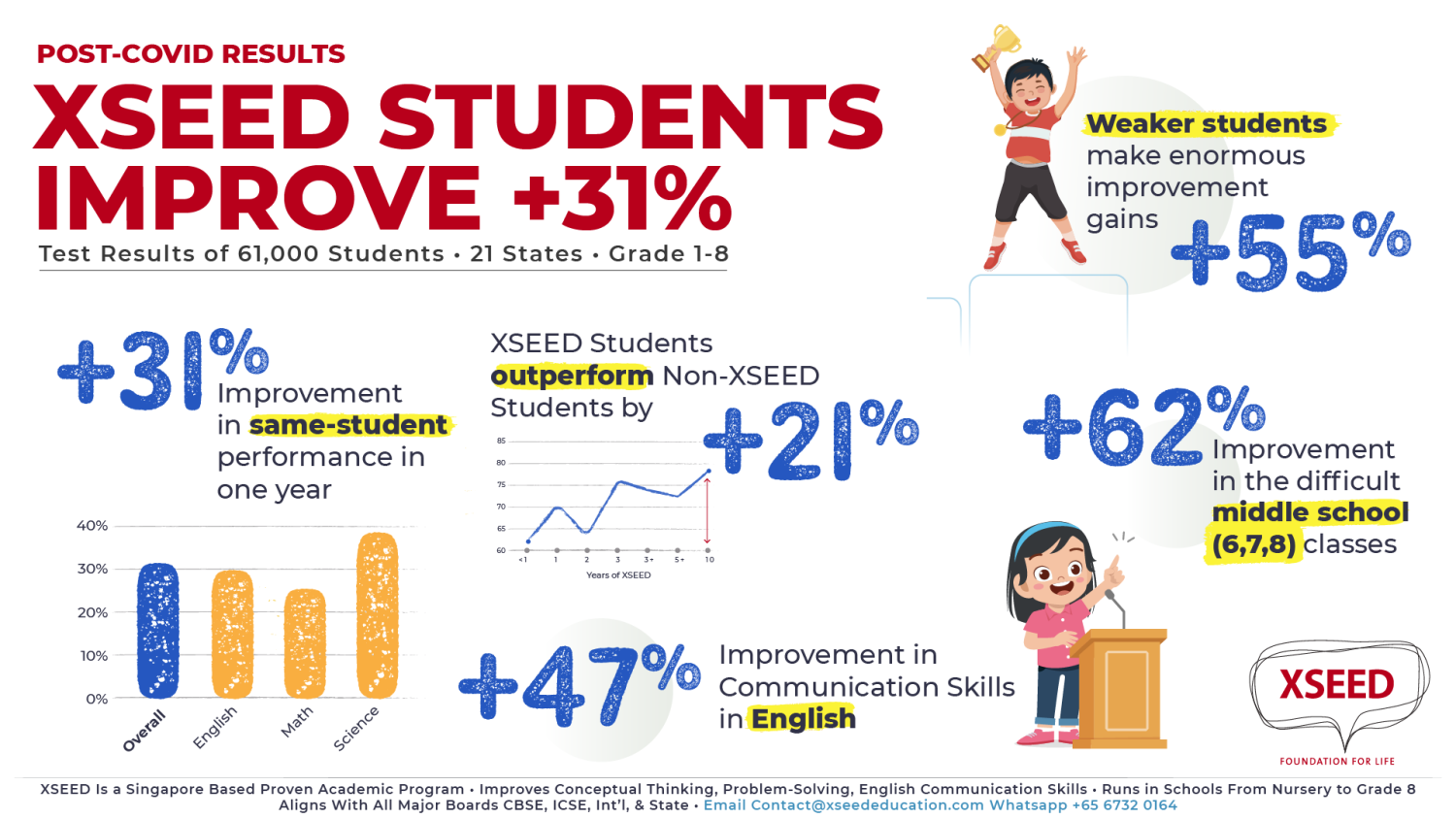 Findings show an impressive 31% year-on-year post-COVID improvement in same-student performance; 30% in English, 26% in Math, 39% in Science and an impressive 47% in Communication Skills at the annual XSEED Learnometer Skill Test 2022